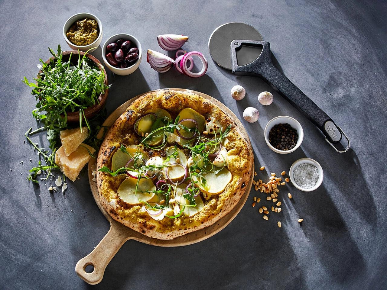 Pizza cutter wheel with a super sharp blade and an 'easy to clean' design. Made of stainless steel and polypropylene.